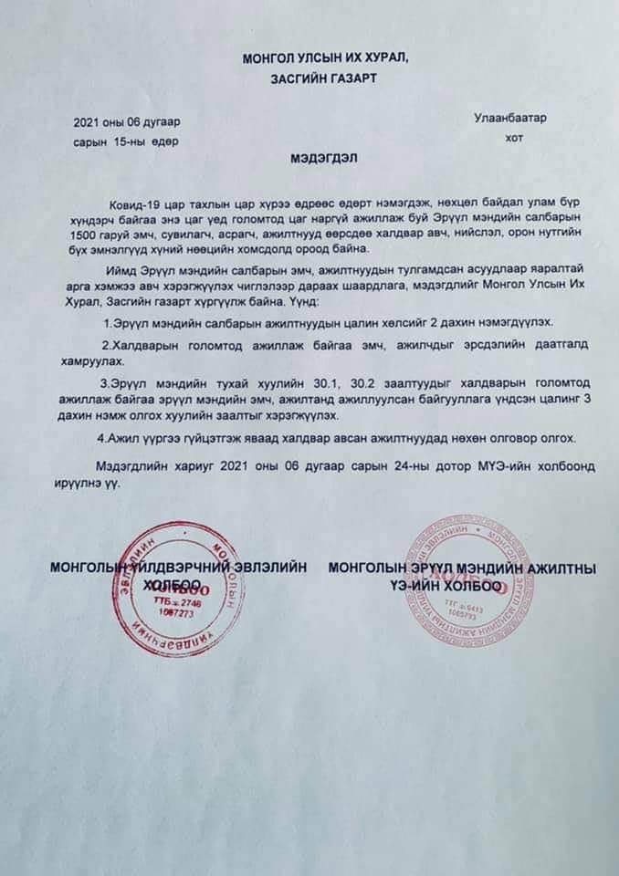 Монголын Эрүүл мэндийн ажилтны үйлдвэрчний эвлэлийн холбооны дарга Х.Ариунаатай холбогдож, дараах зүйлсийг тодрууллаа. Тус эвлэлээс эрүүл мэндийн ажилчдын цалин хөлсийг хоёр дахин нэмэгдүүлэх, улаан бүсэд ажиллаж байгаа эмч, ажилчдыг эрсдэлийн даатгалд хамруулах зэрэг шаардлагыг Засгийн газарт хүргүүлээд байгаа юм.