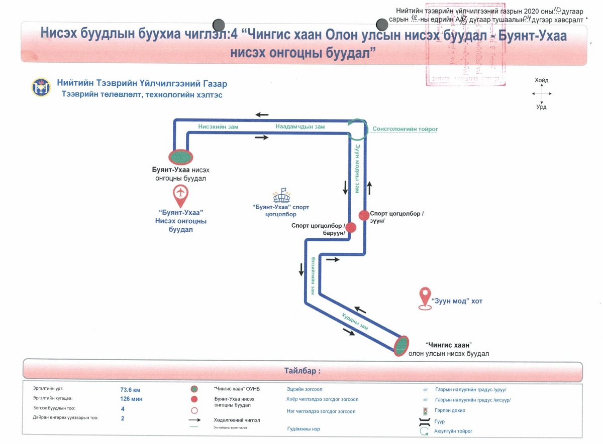 - Нисэх буудлын буухиа чиглэл-4: "Чингис хаан" олон улсын нисэх буудал - Буянт-Ухаа нисэх онгоцны буудал