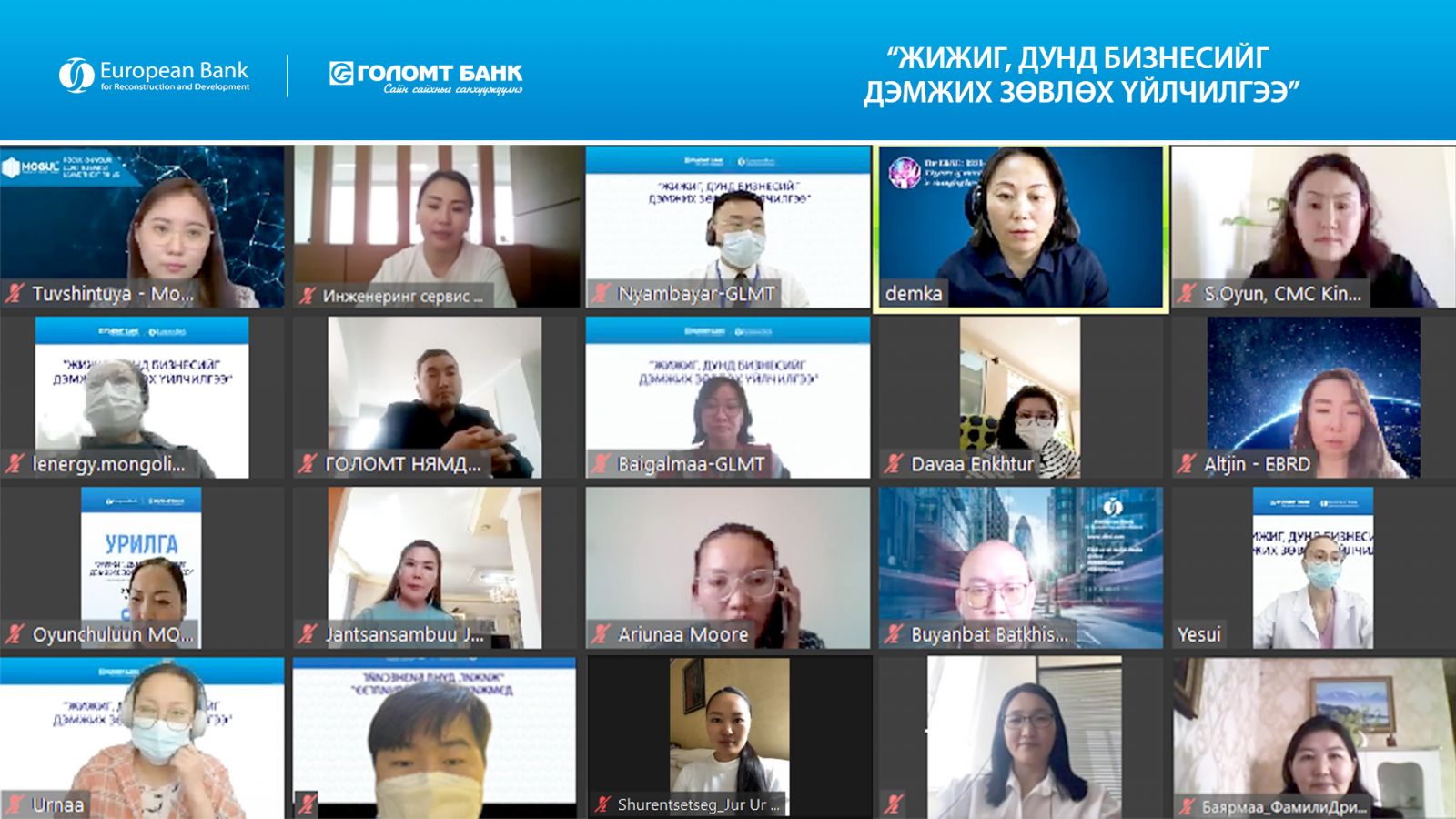 Голомт банк болон Европын сэргээн босголт хөгжлийн банк хамтран “Жижиг, дунд бизнесийг дэмжих зөвлөх үйлчилгээ” хөтөлбөрийг танилцуулах цахим арга хэмжээг энэ сарын 16-ны өдөр зохион байгууллаа. Тус арга хэмжээнд нийслэлд үйл ажиллагаа явуулдаг жижиг дунд бизнес эрхлэгч байгууллагуудын удирдлагууд оролцож, 20 гаруй ААН болон Голомт банкны харилцагчдад зориулан шинээр бий болж буй зөвлөх үйлчилгээний талаарх дэлгэрэнгүй мэдээллийг хүргэлээ.