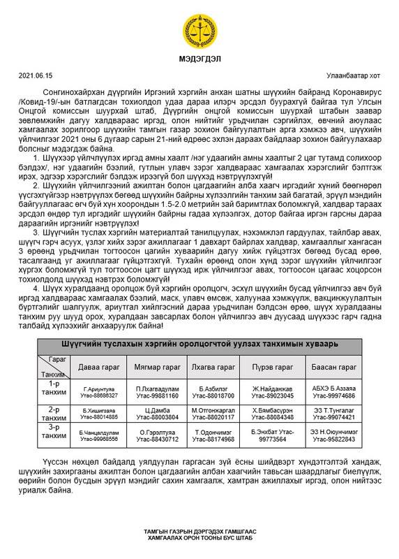 Тус шүүхийн байранд коронавирусний халдвар удаа дараа гарч, халдвар буурахгүй байгаатай холбогдуулан шүүхийн тамгын газраас арга хэмжээ авч,  шүүхийн үйлчилгээг ирэх долоо хоногийн даваа гараг буюу зургаадугаар сарын 21-ний өдрөөс эхлэн зохион байгуулалтыг өөрчилж байгаа аж. Тухайлбал, нэг удаагийн бээлий, улавчгүй иргэдийг шүүхийн байр руу нэвтрүүлэхгүй бөгөөд хуралд оролцохоор ирсэн иргэдийн вакцинд хамрагдсан эсэхийг шалгаж, тогтсон цагт нэвтрүүлэхээр болсон байна.