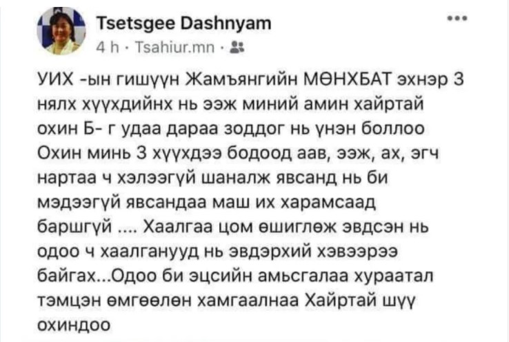 Хуулиар асуудлаа шийдүүлээчээ .Сошиалаар ингэж хүний нэр төрд халдах эрх энэ авгайд бас байнаа. Жаахан учиртай ярьж бичүүлж баймаар даа.бичиж бичүүлж байгаа нөхдүүд гэгээрэх болтугай.. Үнэн учир нь олдож таарах.
