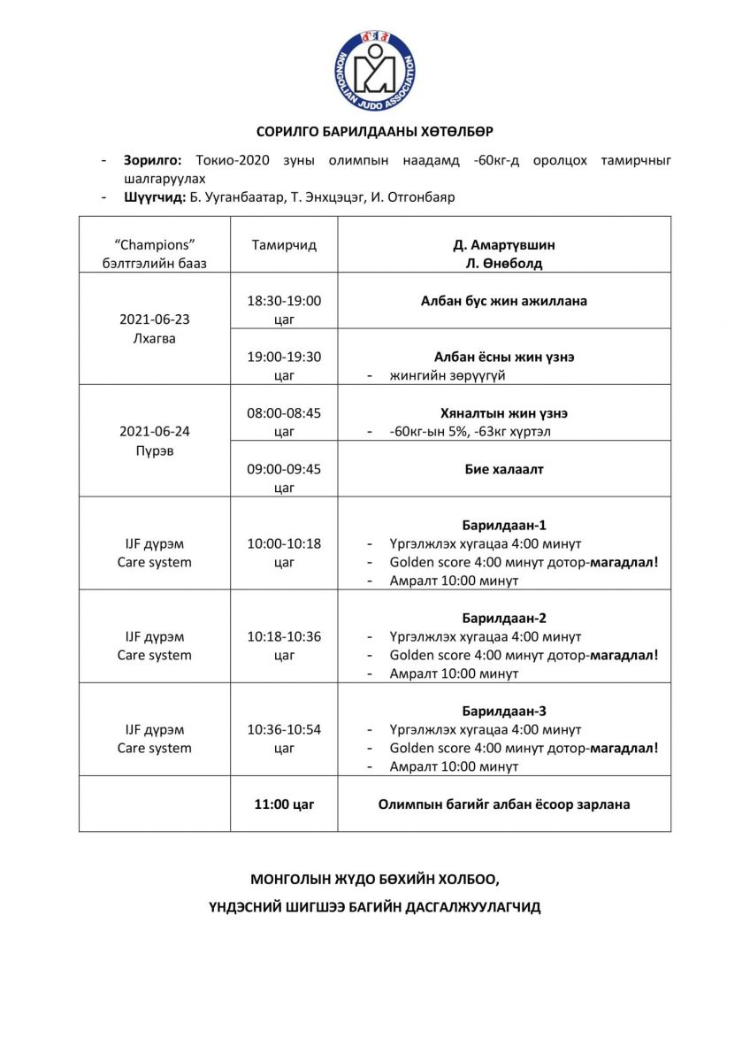Эрэгтэй 60 кг –д манайд дэлхийн чансааны 21 дэх бөх, 2821 оноотой Д.Амартүвшин, дэлхийн чансааны 24 дэх бөх, 2608 оноотой Л.Өнөболд нар бий. Монголын жүдо бөхийн холбооноос хоёр тамирчны хооронд "Токио 2020" зуны олимпийн наадамд эрэгтэйчүүдийн 60 кг жинд эх орноо төлөөлөн оролцох эрхийн төлөө сорилго барилдаан хийхээр шийджээ.