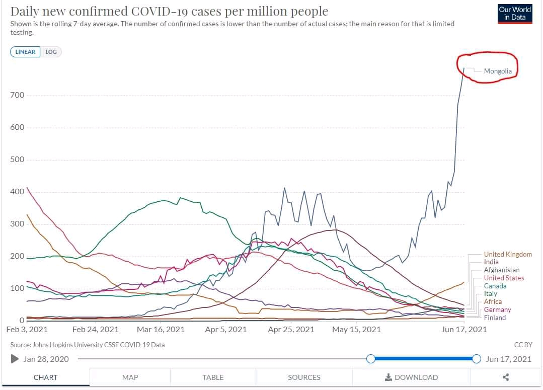"Our World in Data" мэдээллээр зургаадугаар сарын 18-ны байдлаар өдөрт шинээр илэрч буй ковидын тохиолдол 1 сая хүн ам тутамд, зарим улс орнуудаар ямар байгааг графикаас үзэхэд Монголд шинэ халдвар маш өндөр байгааг Зүүн Финляндын их сургуулийн  багш, нийтийн эрүүл мэндийн доктор Д.Жавхланбаяр хэлж байна.