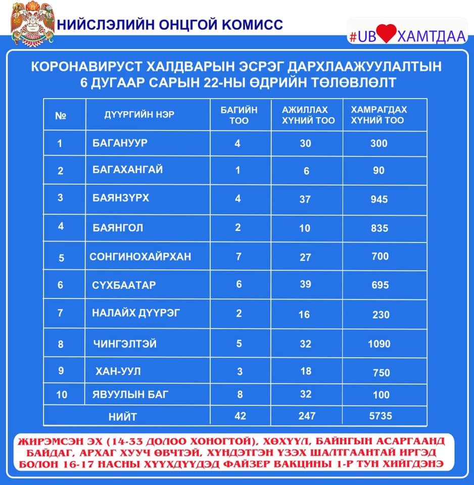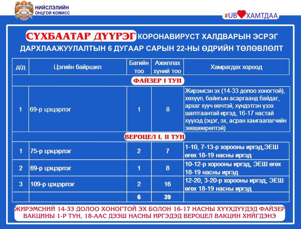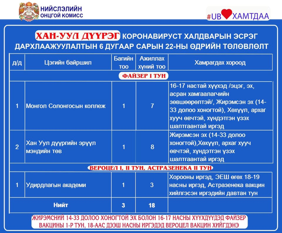 2021.06.21-нд нийслэлийн хэмжээнд 1 дүгээр тунд 1649, 2 дугаар тунд 2192, нийт 3841 иргэнийг дархлаажуулалтад хамрууллаа. Вакцинжуулалт эхэлснээс хойш нийслэлийн 18-аас дээш насны иргэдийн 102 хувь буюу 973047 нь I тунд, 90 хувь буюу 858461 нь II тунд хамрагдаад байна. Мөн нийт 605 (5.08 хувь) жирэмсэн эх, 16-17 насны 5130 (15.1 хувь) хүүхэд тус тус дархлаажуулалтад хамрагдаж, вакцины I тунг хийлгээд байна.
