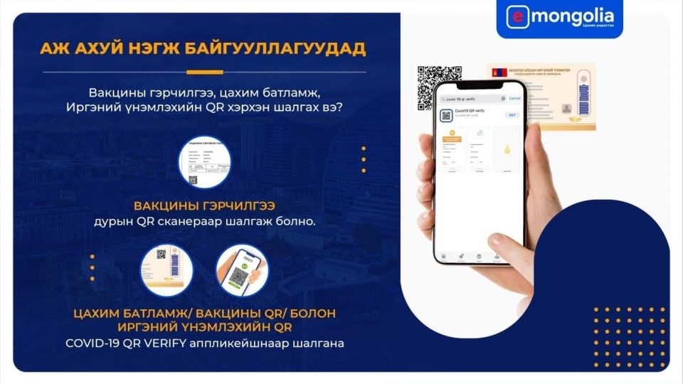 – Харин иргэн иргэний үнэмлэх эсвэл вакцины цахим батламж буюу / вакцины QR / биедээ авч яваа бол “COVID 19 QR VERIFY” аппликейшныг үйлчилгээний байгууллагын ажилтан гар утсандаа суулгаж, үйлчлүүлэгчээ таньж нэвтрүүлнэ.