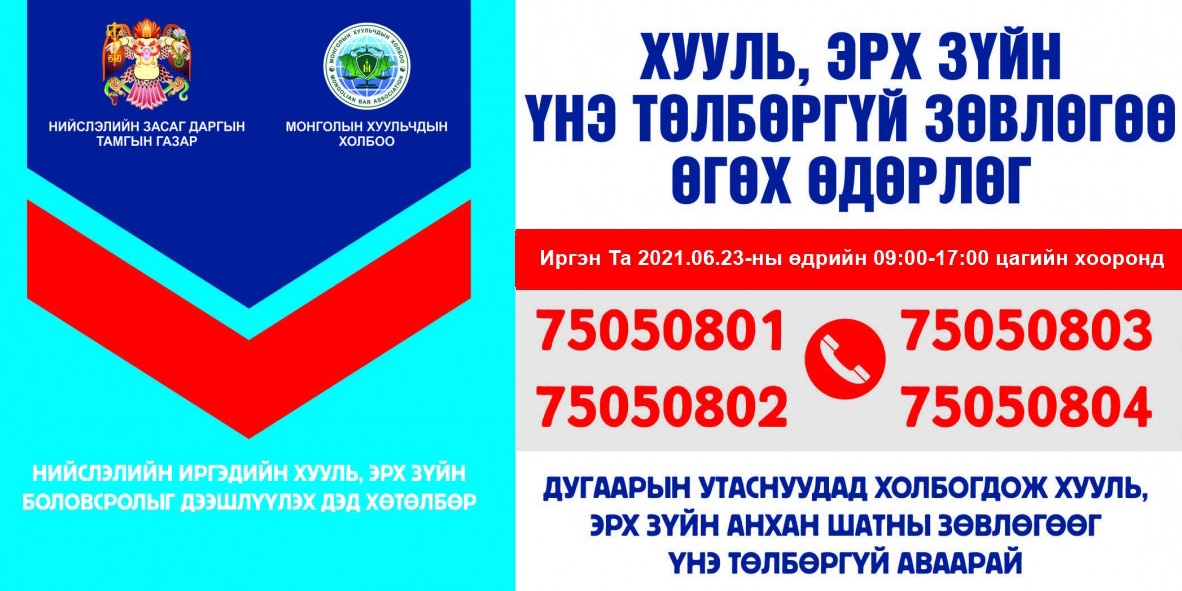 Энэ сарын өдөрлөг маргааш буюу 2021 оны 06 дугаар сарын 23-ны өдрийн 09:00-17:00 цагийн хооронд явагдах тул иргэн та /75050801, 75050802, 75050803, 75050804/ дугаарын утаснуудад холбогдож хууль, эрх зүйн зөвлөгөө, мэдээллийг авах боломжтой.