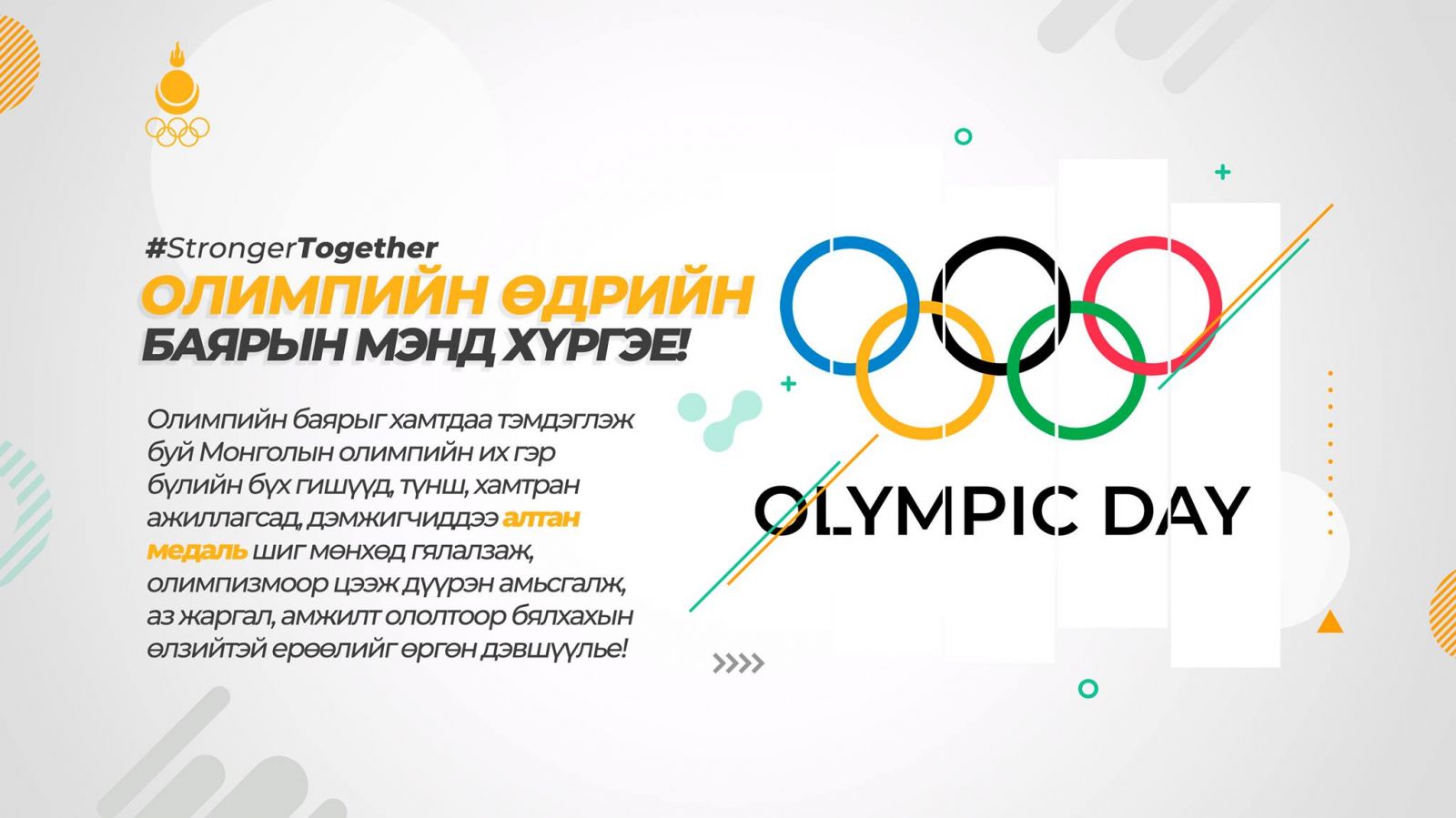 Олимпын баярыг хамтдаа тэмдэглэж буй Монголын олимпын их гэр бүлийн бүх гишүүд, түнш, хамтран ажиллагсад, дэмжигчиддээ алтан медаль шиг мөнхөд гялалзаж, олимпизмоор цээж дүүрэн амьсгалж, аз жаргал, амжилт ололтоор бялхахын өлзийтэй ерөөлийг өргөн дэвшүүлье!