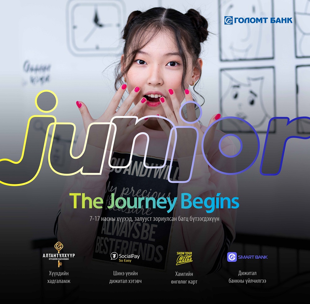 Голомт банкнаас санал болгож буй “JUNIOR” багцыг сонгосноор хүүхэд тань шинэ үеийн, хариуцлагатай иргэдийн нэг болохоор санхүүгийн цоо шинэ аялалд гарах юм.