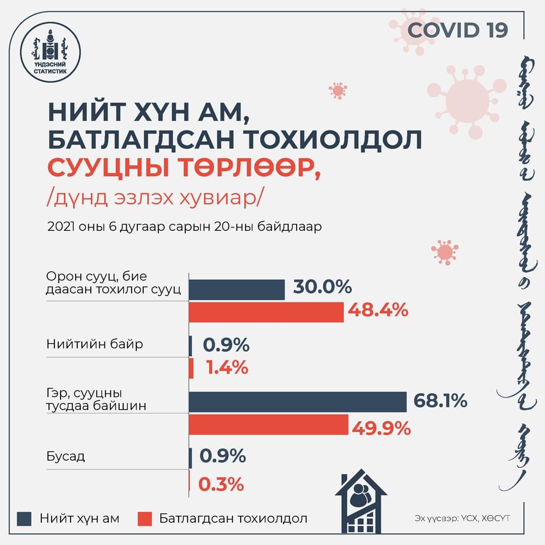 Ковидын батлагдсан тохиолдлыг 2021 оны зургаадугаар сарын 20-ны байдлаар амьдарч буй сууцны төрлөөр авч үзвэл 49.9 хувь нь гэр, сууцны тусдаа байшинд, 48.4 хувь нь орон сууц болон бие даасан тохилог сууцанд байна.