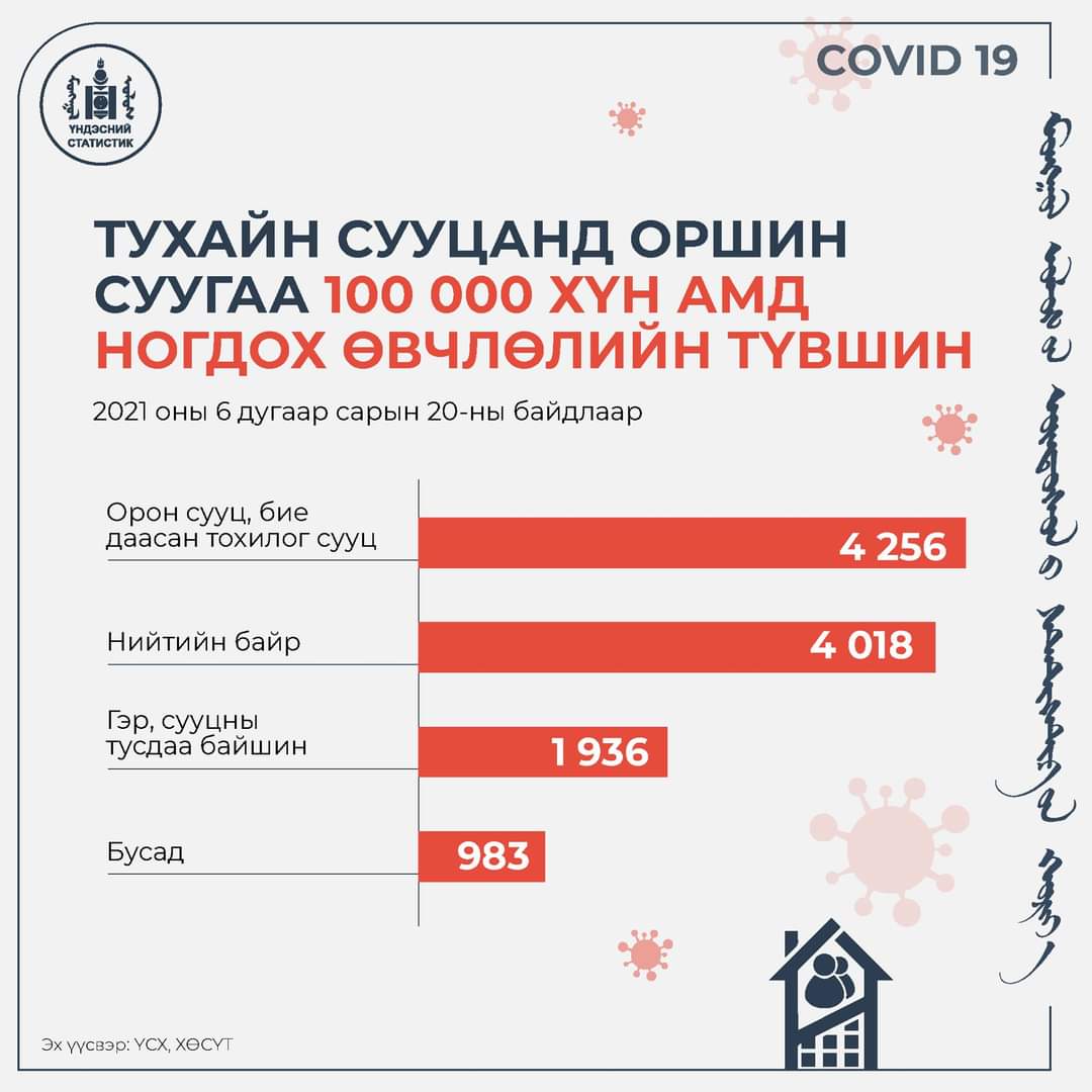 100,000 хүн амд ногдох өвчлөлийг авч үзвэл "КОВИД-19"-ийн батлагдсан тохиолдол гэр хороололд бага байгаа бол орон сууц болон нийтийн байранд их байна гэж ҮСХ-ноос мэдээллээ.