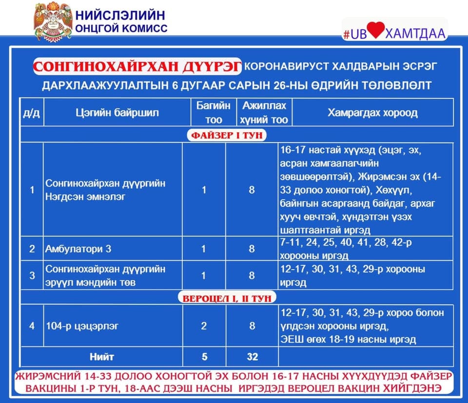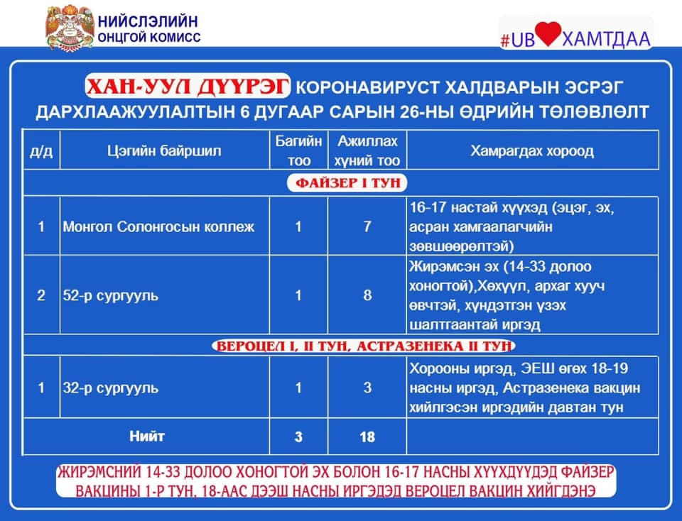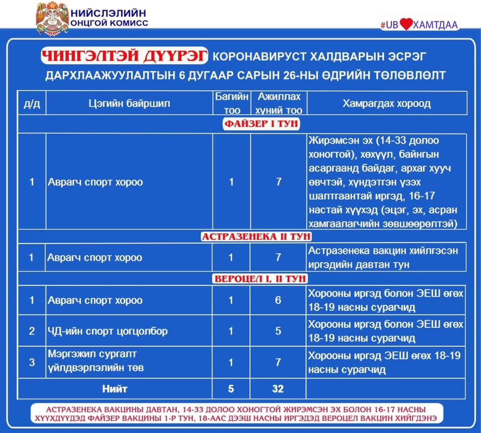 Өнөөдөр буюу зургаадугаар сарын 26-ны өдөр Улаанбаатар хотод 8 явуулын, 22 суурин цэгт дархлаажуулалтын 42 багийн 262 эмч, ажилчид 3488 иргэнийг дархлаажуулна.