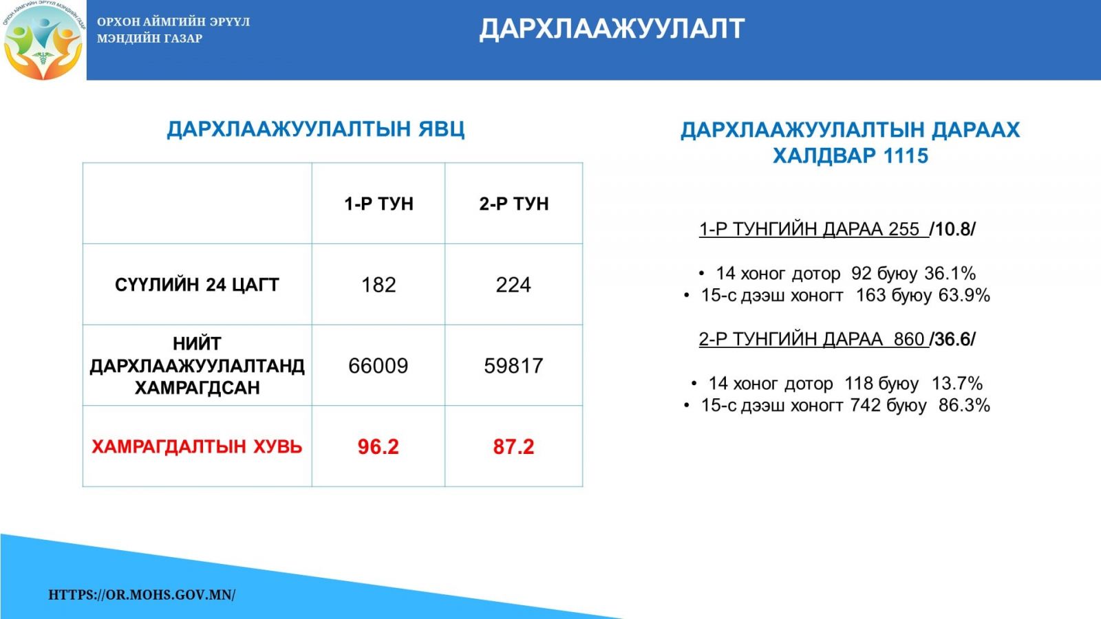 7. Сүүлийн 24 цагт дархлаажуулалтын 1-р тунд 182 хүн хамрагдаж 93.2 хувьтай, 2-р тунд 224 хүн хамрагдаж 87.2 хувьтай байна.