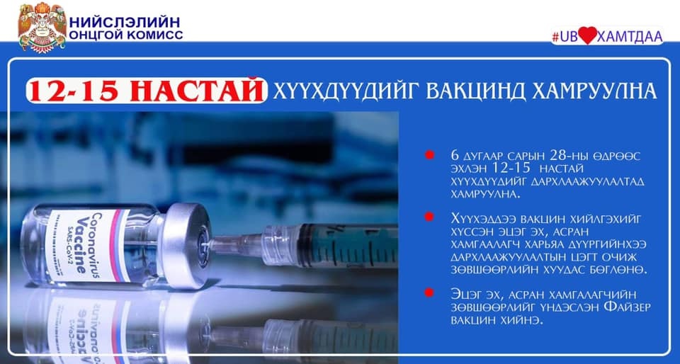 Энэ сарын 28 буюу даваа гарагаас 12-15 насны хүүхдүүдийг эцэг эх, асран хамгаалагчийн зөвшөөрлөөр сайн дурын үндсэн дээр дархлаажуулалтад хамруулж эхэлнэ.