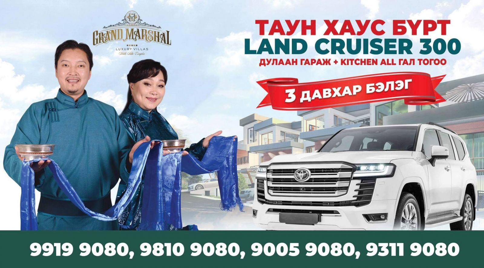 ТАУН ХАУС бүрт "ЛАНД-300" автомашин бэлэглэх аж. Тодруулбал, “Grand Marshal Luxury villas" дөрвөн улирлын цогцолбор хотхоны  гурван давхар ТАУН ХАУС-ыг метр квадратын үндсэн үнэ болох 5.950.000 төгрөгөөр, нийт үнийн дүнгийн 100 хувийн төлөлтөөр худалдан авснаар энэхүү урамшууллын эзэн болох юм.
