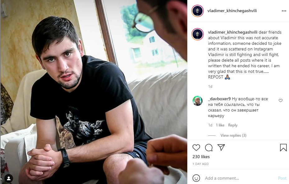 Харин Владимир Хинчегашвили энэ мэдээллийг үгүйсгэлээ. Тэрээр инстаграмдаа “Анд найзууд аа, хэн нэг нь тоглоомоор ийм мэдээлэл тараасан байна шүү. Би дахин барилдана. Намайг зодог тайлсан гэж бичсэн бүх мэдээгээ устгаарай” гэж бичсэн байлаа.
