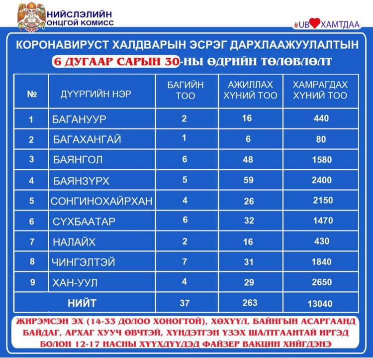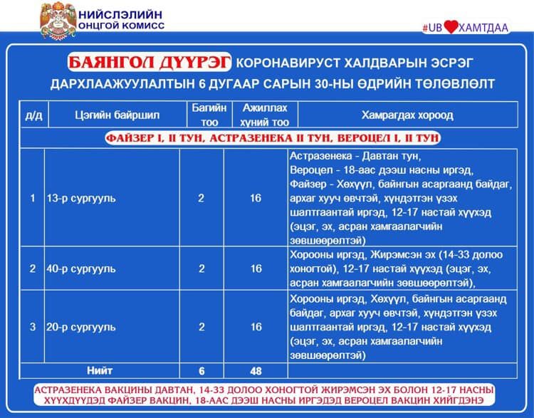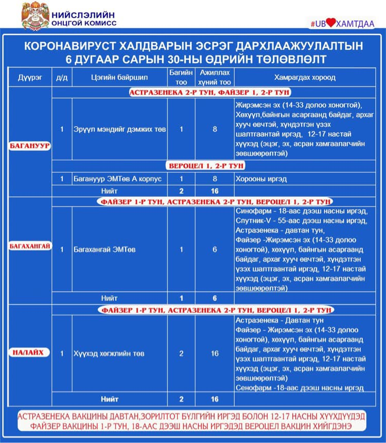 Улаанбаатар хотод өнөөдөр /2021.06.30/ 23 суурин цэгт 37 багийн 263 эмч, ажилтан ажиллаж, 13040 иргэнийг дархлаажуулахаар төлөвлөлөө.
