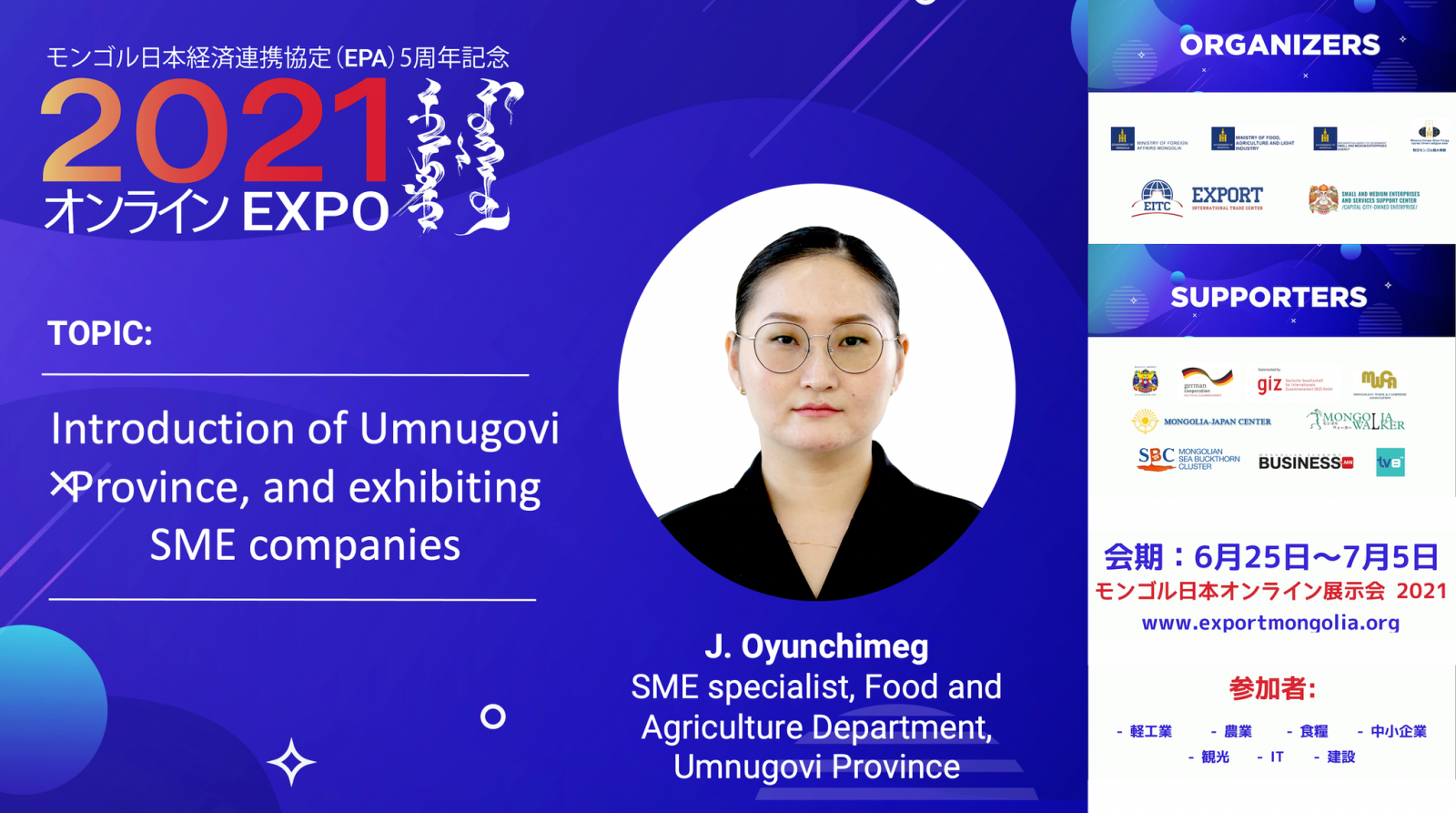 “Монгол, Японы ЭЗТХ-ийн таван жилийн ойн цахим форум, үзэсгэлэн 2021” арга хэмжээ зургаадугаар сарын 25-наас долоодугаар сарын 05-ны өдрүүдэд www.ExportMongolia.org цахим талбарт зохион байгуулагдаж байгаа билээ.