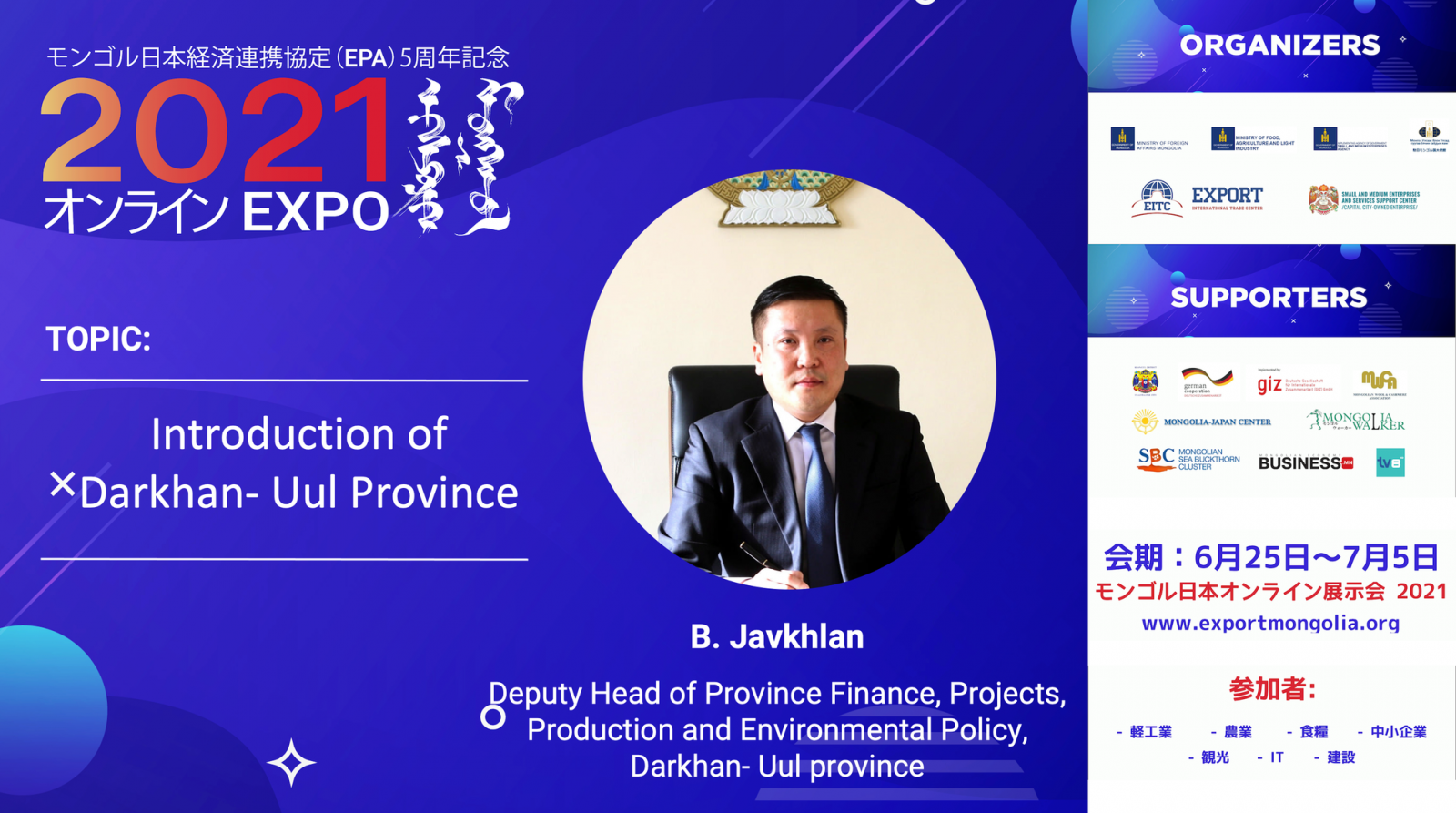 Монгол, Японы ЭЗТХ-ийн таван жилийн ойн цахим форум, үзэсгэлэн 2021” арга хэмжээ зургаадугаар сарын 25-наас долоодугаар сарын 05-ны өдрүүдэд www.ExportMongolia.org цахим талбарт зохион байгуулагдаж байгаа билээ.