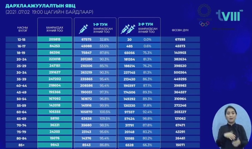 Эрүүл мэндийн яамнаас өгсөн коронавирусний халдварын нөхцөл байдлын өнөөдрийн (2021.07.03) ээлжит мэдээллийн үеэр ковидын эсрэг вакцинжуулалтын талаар дараах мэдээллийг өглөө.