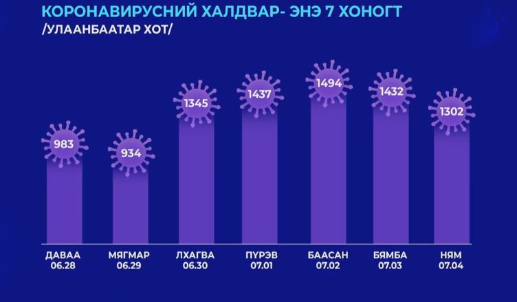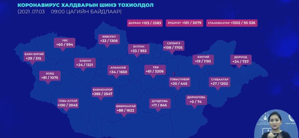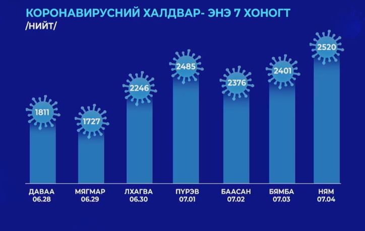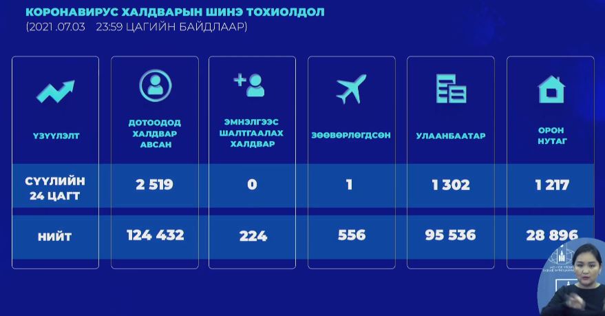 Сүүлийн 24 цагийн хугацаанд 9000 орчим сорьцод шинжилгээ хийхэд, ковидын 2520 тохиолдол улсын хэмжээнд батлагдлаа. Ингэснээр нийт батлагдсан тохиолдол 125.260 болж байна. Өнгөрсөн нэг өдрийн хугацаанд уг өвчний хүнд хэлбэрийн улмаас 8 хүн амь насаа алдсан харамсалтай мэдээллийг дуулгалаа. Монгол Улс өнөөдрийн байдлаар 617 иргэнээ энэ өвчний улмаас, цаг бусаар алдаад байна. Сүүлийн хоногт 1886 хүн эдгэрч, нийт эдгэрсэн хүний тоо 84.819 болж байна.