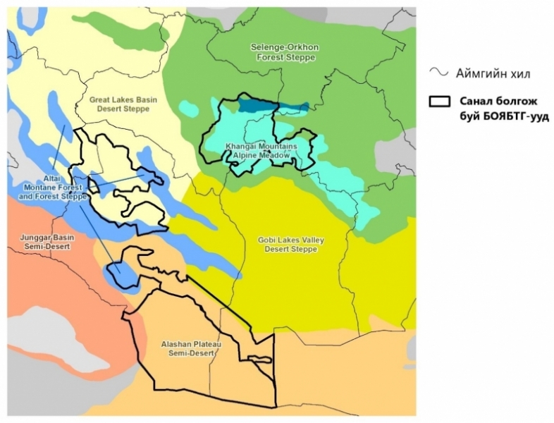 Өмнө нь тодорхойлсон үндэсний хэмжээний хамгаалах шаардлагатай чухал газар нутгуудыг дахин хянаж үзсэний үндсэн дээр экосистемийн төлөөллийг хангах зорилтуудыг хангасан, экологийн бүрэн бүтэн нэгдмэл байдал болон экосистемийн холбоос нутаг, тэдгээрийн үр ашгийн оновчтой байдлыг хангаж байх шалгууруудыг хангасан нийт 11,377,400 га талбай бүхий дараах 4 газар нутгийг Дэлхийн Биологийн Олон Янз байдлын Түшиц газарт (БОЯБТГ) бүртгүүлэхээр санал болгож байна.Үүнд: