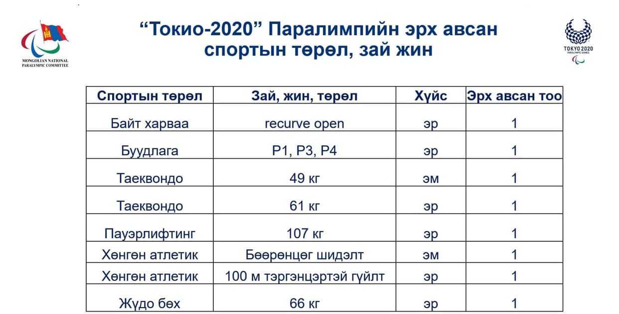 Ингэснээр Монголын паралимпын баг тамирчид "Токио-2020" паралимпын наадамд өнөөдөр (2021.07.04)-ийн байдлаар 6 төрөлд 8 тамирчин оролцох эрхтэй болж байна.