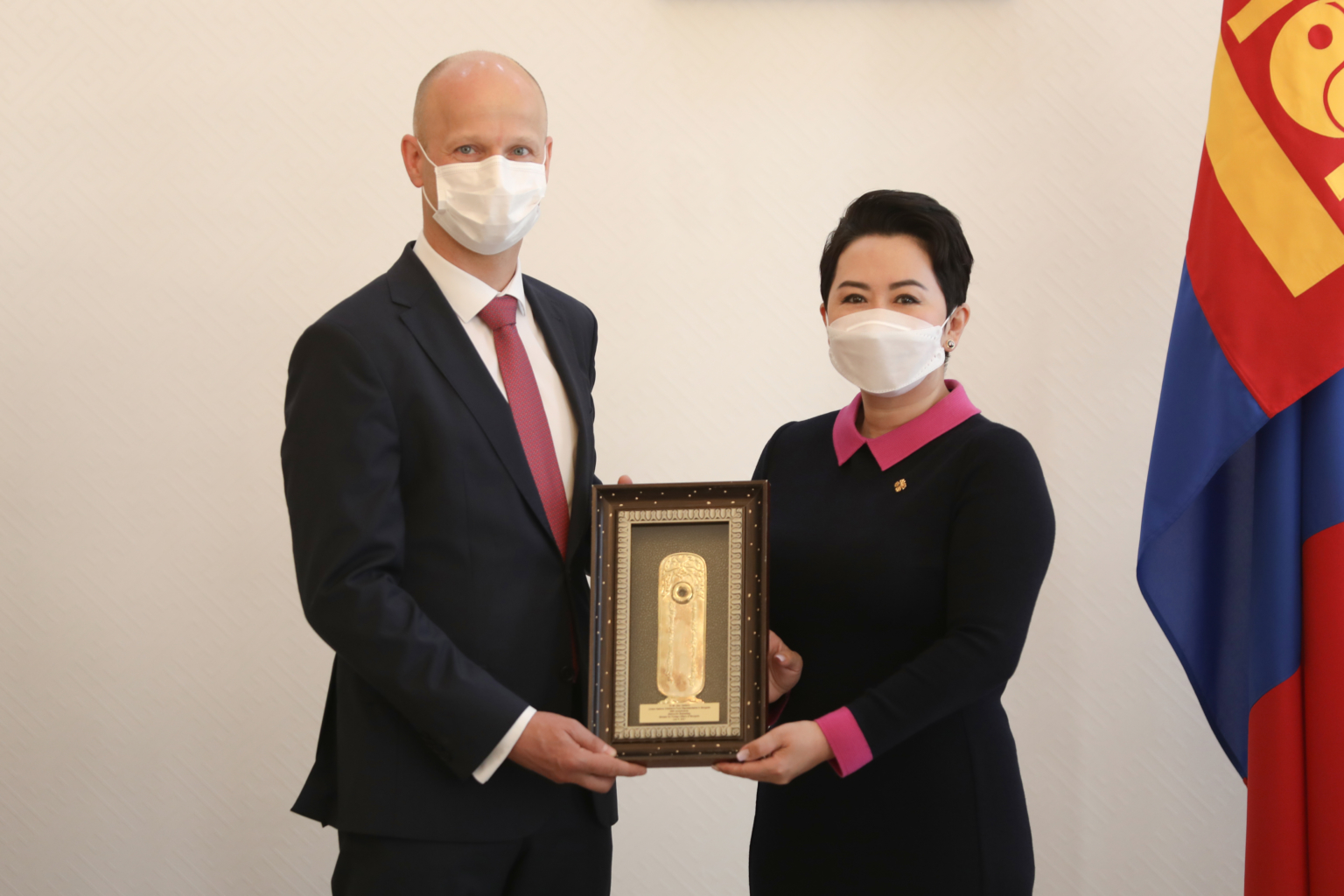Уулзалтын төгсгөлд Сайд Б.Батцэцэг цаашдын ажилд үйлсэд нь амжилт хүсч, Суурин төлөөлөгч А.Хайкенсд ГХЯ-ны “Алтан гэрэгэ”-г дурсгал болгон гардууллаа.
