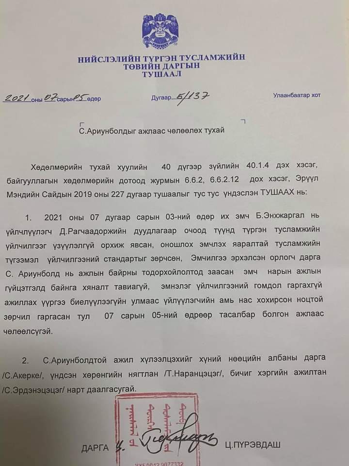 С.Ариунболдыг ажлын байрны тодорхойлтод зааснаар эмч нарын ажлын гүйцэтгэлд хяналт тавиагүй, ажиллах үүргээ биелүүлээгүй улмаас үйлчлүүлэгчийн амь нас хохирсон ноцтой зөрчил гаргасан тул 2021.07.05-ны өдрөөр тасалбар болгож ажлаас нь чөлөөлж, Д.Бат-Ундрахыг томилжээ.