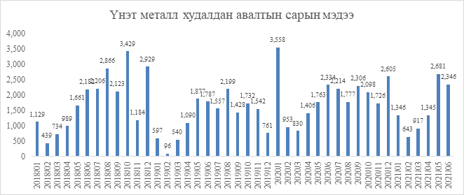 Монголбанк 2021 оны зургаадугаар сард 2.3 тн үнэт металл худалдан авч, оны эхнээс өссөн дүнгээр нийт 9.3 тн үнэт металл худалдан аваад байна. Энэ нь өмнөх оны мөн үетэй харьцуулбал 1.5 тн-оор буурсан үзүүлэлт юм.