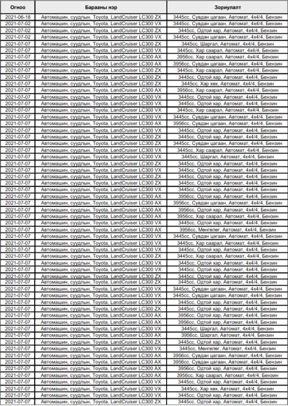 Иргэдийн чингэлэг жил тойрон саатаж, Зам тээврийн хөгжлийн яаманд танилтай хүмүүсийн ачаа бараа тав хоногт ирж байгаа нь нийгмийн сэтгэлзүйд мөнгөтэй, мөнгөгүй гэсэн давхаргыг илүү гаргаж байна. Бэлтэй давхарга, жирийн иргэдийн ялгаврыг ядаж чингэлэг дээрээ гаргамааргүй байна, Л.Халтар сайд аа. Монгол Улсад орж ирсэн Ланд круйзер 300 маркийн автомашины дэлгэрэнгүй жагсаалтыг хүргэе.