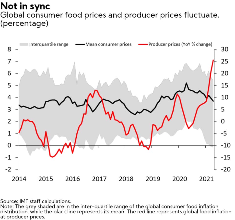 БАРИМТ 2:. Цар тахлын үед хөл хорио тогтоох арга хэмжээ, нийлүүлэлтийн сүлжээн дэх гацаанууд хүнсний бүтээгдэхүүний үнэ огцом өсөхөд нөлөөлсөн. Хүнсний бүтээгдэхүүн үйлдвэрлэгчдийн үнийн индекс 2020 оны дундаас хойш тасралтгүй өссөөр жилийн өмнөх түвшнээс 25 хувиар өсөөд байна. Дараах зургаас харахад үйлдвэрлэгчийн үнийн индексийн өсөлт нь хэрэглэгчийн гар дээр ирэх хүнсний бүтээгдэхүүний үнийн өсөлтөд хамгийн багадаа 6 сарын хоцролттой нөлөөлдөг байна. Энэ нь хүнсний үйлдвэрлэгчийн үнийн өндөр өсөлтийг даган ирэх 6-12 сарын хугацаанд хүнсний инфляц дэлхий даяар өндөр байх дохиог өгч байна.