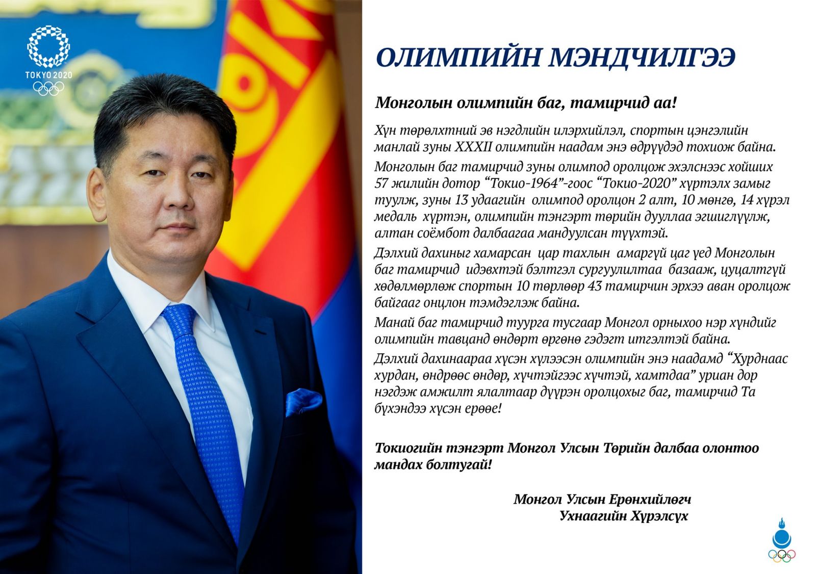 Дэлхий дахинаараа хүсэн хүлээсэн олимпын энэ наадамд “Хурднаас хурдан, өндрөөс өндөр, хүчтэйгээс хүчтэй, хамтдаа” уриан дор нэгдэж амжилт ялалтаар дүүрэн оролцохыг баг, тамирчид Та бүхэндээ хүсэн ерөөе!