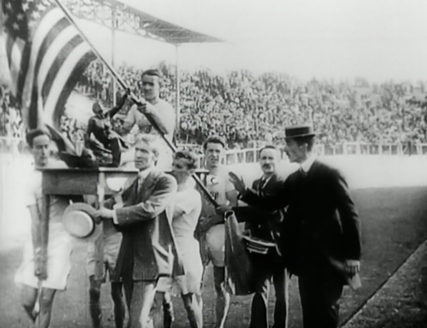 Хоёр дахь тохиолдол нь АНУ-ын багтай холбоотой. Тус улсын багийн туг баригч Ралф Роуз улсынхаа тугийг дүрмийн дагуу Их Британийн хаан VII Эдуардын өмнө бөхийлгөхөөс татгалзжээ. Тухайн наадам огт оролцоогүй Хятад улсын далбааг АНУ-ын далбааны оронд андууран өлгөсөнд Америкийн тамирчид ийн дургүйцлээ илэрхийлж байв. Харин Роуз бөөрөнцөг шидэлтийн Олимпын аварга цолоо энэ наадам дээр дахин баталсан байна.