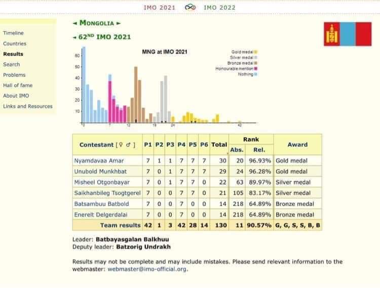 Олон Улсын Математикийн 62-р олимпиадад манай сурагчид тун амжилттай оролцож багийн дүнгээр дэлхийн 105 орноос 11-р байрт орж түүхэн амжилт үзүүллээ. Сурагчдын маань амжилт санамсаргүй зүйл байсангүй. Олон жилийн туршид бага, дунд ангиас нь олимпиадад бэлтгэн оролцуулж байсан Б.Батцэнгэл, Н.Баянбат, Д.Алтангэрэл багш, Д.Ганчимэг зэрэг багш нарын тавьсан маш сайн суурь болон сүүлийн жилүүдэд олон улсын олимпиадын бэлтгэлийг өндөр түвшинд хүргэж хичээл зүтгэлтэй ажиллаж байгаа математикийн олимпиадын хорооны гишүүн Г.Баярмагнай (өмнөх дарга), Ү. Отгонбаяр, Г. Батзаяа, У. Батзориг, Т. Хулан багш нарын нарын ажлын үр дүн юм. Түүнчлэн математикийн олимпиадыг Монгол улсад өндөр түвшинд хүргэн хөгжүүлж ирсэн ахмад үеийн багш нарын гавъяа зүтгэлийг дурдахгүй өнгөрч болохгүй нь ойлгомжтой юм. Амжилт бол 1% авъяас, 99% нь хөдөлмөр гэдгийг жинхэнэ утгаар нь харуулж байгаа авъяаслаг сурагчдын маань олон жилийн нөр их хөдөлмөрийн үр дүн өнөөдөр гарч байна. Та бүхэндээ нийт математикчдынхаа өмнөөс гүн талархал илэрхийлье.