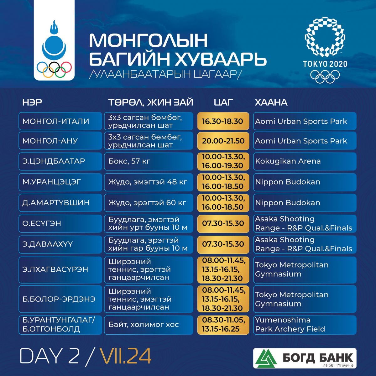 Олимпын хоёр дахь өдөр буюу долоодугаар сарын 24-нд манай тамирчид спортын 6 төрөлд өрсөлдөнө.