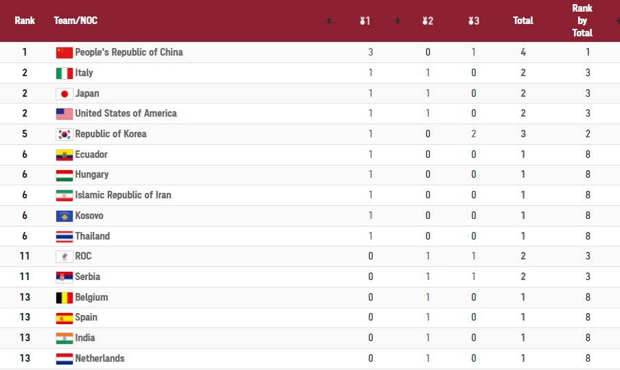 Токиогийн олимпын наадмын хоёр дахь өдрийн байдлаар Хятадын баг тэргүүлж, Итали, Японы баг удаалж байна.