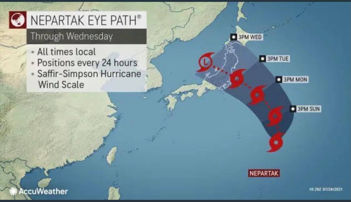 Япон улс, тэр дундаа Токио хотыг маргааш (2021.07.27) орон нутгийн цагаар 15.00 орчимд далайн хар шуурга дайран өнгөрөх төлөвтэй байгааг анхаарууллаа. Үүний улмаас гадаа талбайд явагддаг зарим тэмцээн уралдаан эхнээсээ хойшлоод байна.