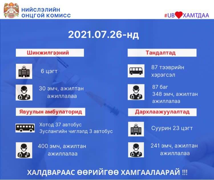Өчигдөр буюу долоодугаар сарын 26-нд Улаанбаатарт шинжилгээний зургаан цэгт 30 эмч, ажилтан, Тандалт, хариу арга хэмжээний 87 багт 348 эмч, ажилтан 87 тээврийн хэрэгсэлтэй ажиллажээ.