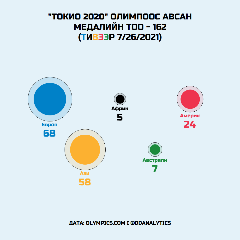 Долоодугаар сарын 26-ны байдлаар "Токио 2020" олимпоос дэлхийн улс орнуудын авсан медалийн тоо 162 болсныг "DD Analytics" мэдээлсэн байна. Тивээр нь харвал Ази, Европ тивүүд тэргүүлж байна.