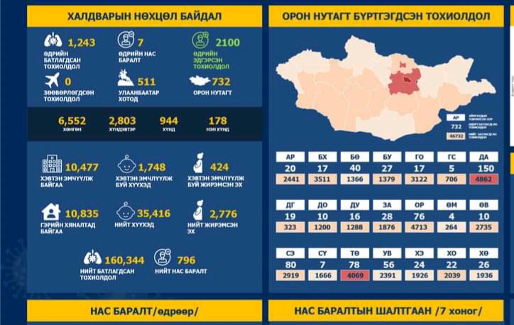 Эрүүл мэндийн яамны өнөөдрийн мэдээллээр, өнгөрсөн 24 цагийн хугацаанд коронавирусний 1243 тохиолдол илэрсэн байна. Шинээр батлагдсан нийт тохиолдлын 511 нь Улаанбаатар хотод, 732 нь хөдөө, орон нутагт бүртгэгджээ. Орон нутагт батлагдсан тохиолдлын хамгийн олон буюу 150 нь Дархан-Уул аймагт бүртгэгджээ.