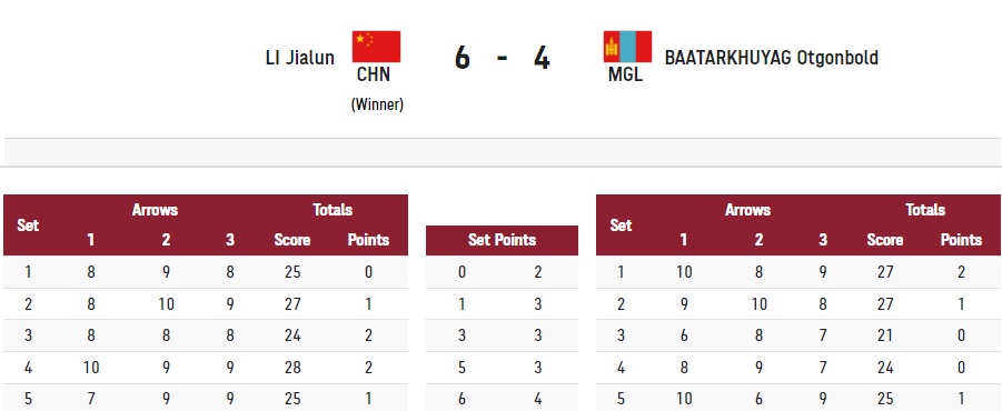 Харин эрэгтэйчүүдийн 1/32-т 109 дүгээр байн дээр Баатархуягын Отгонболд БНХАУ-ын Жиалун Литэй цэц сорилоо. Манай тамирчин 4.6 ялагдлаа.