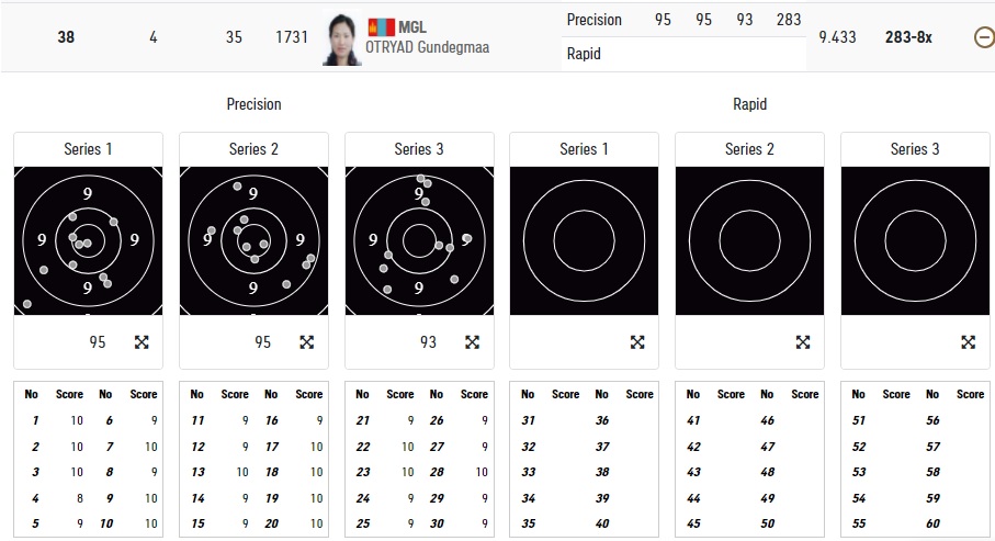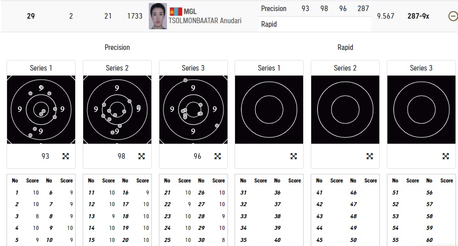 Манай Цолмонбаатарын Анударь, Отрядын Гүндэгмаа нар өнөөдөр тогтоол буудаад маргааш өглөө 09:00 цагаас (Улаанбаатарын цагаар) рапид буюу хурдан буудалтаа хийж, нийлбэрээр эхний наймд шалгарсан нь маргааш 13:00 цагаас финалтай.
