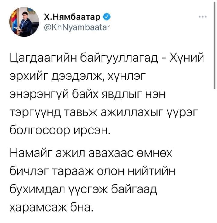 Тэгвэл Хууль зүй, дотоод хэргийн сайд Х.Нямбаатар эл хэрэгт өөрийн байр сууриа илэрхийлжээ.