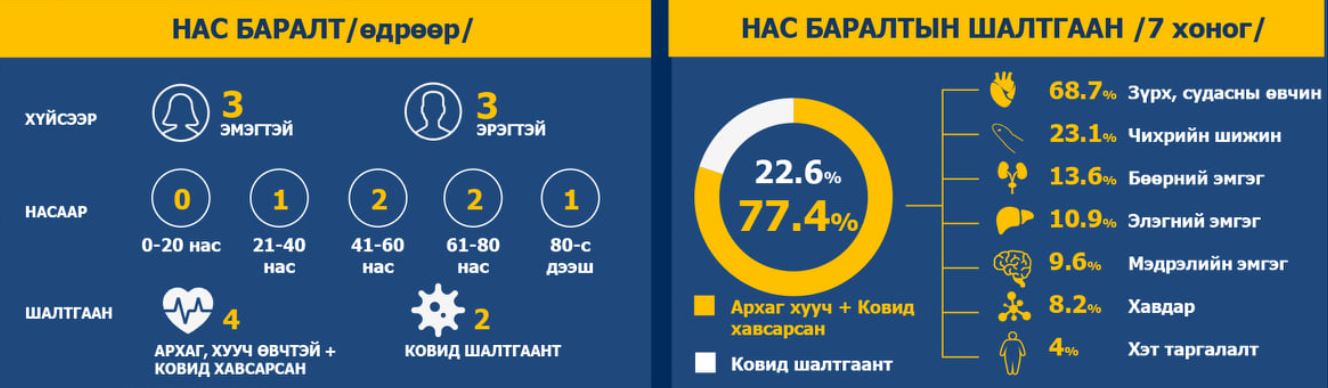 Сүүлийн долоо хоногийн хугацаанд бүртгэгдсэн нас баралтуудын 77.4 хувь нь архаг хууч өвчин ковид хавсарсан бол 22.6 хувь нь ковидын шалтгаант байсан гэж мэдээлэлд дурджээ. Өнөөдрийн байдлаар Монгол Улсад ковидоор өвчлөн нас барсан иргэдийн тоо 815 болоод байна.