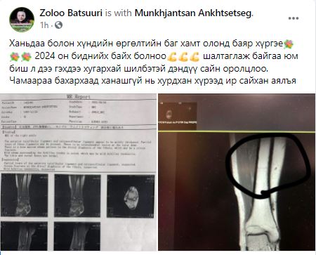 Амаржаад дөрөвхөн сартай байхдаа бэлтгэл сургуулилтаа эхлүүлж, олимпын эрхийн тэмцээнд оролцож эхэлсэн манай тамирчин олимпын өмнө шилбэндээ гэмтэл авсан байсан талаар түүний талаар нөхөр Б.Золжаргал сошиал хуудаснаа бичжээ.