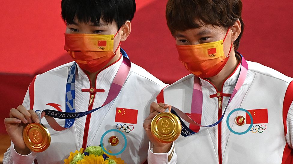 Олон улсын олимпын хороо медаль гардуулах үеэр Хятадын удирдагч агсан Мао Зэдүний хөрөг бүхий тэмдэгтэй гарч ирсэн Хятадын алтан медальтай эмэгтэй дугуйчдыг шалгаж байна.