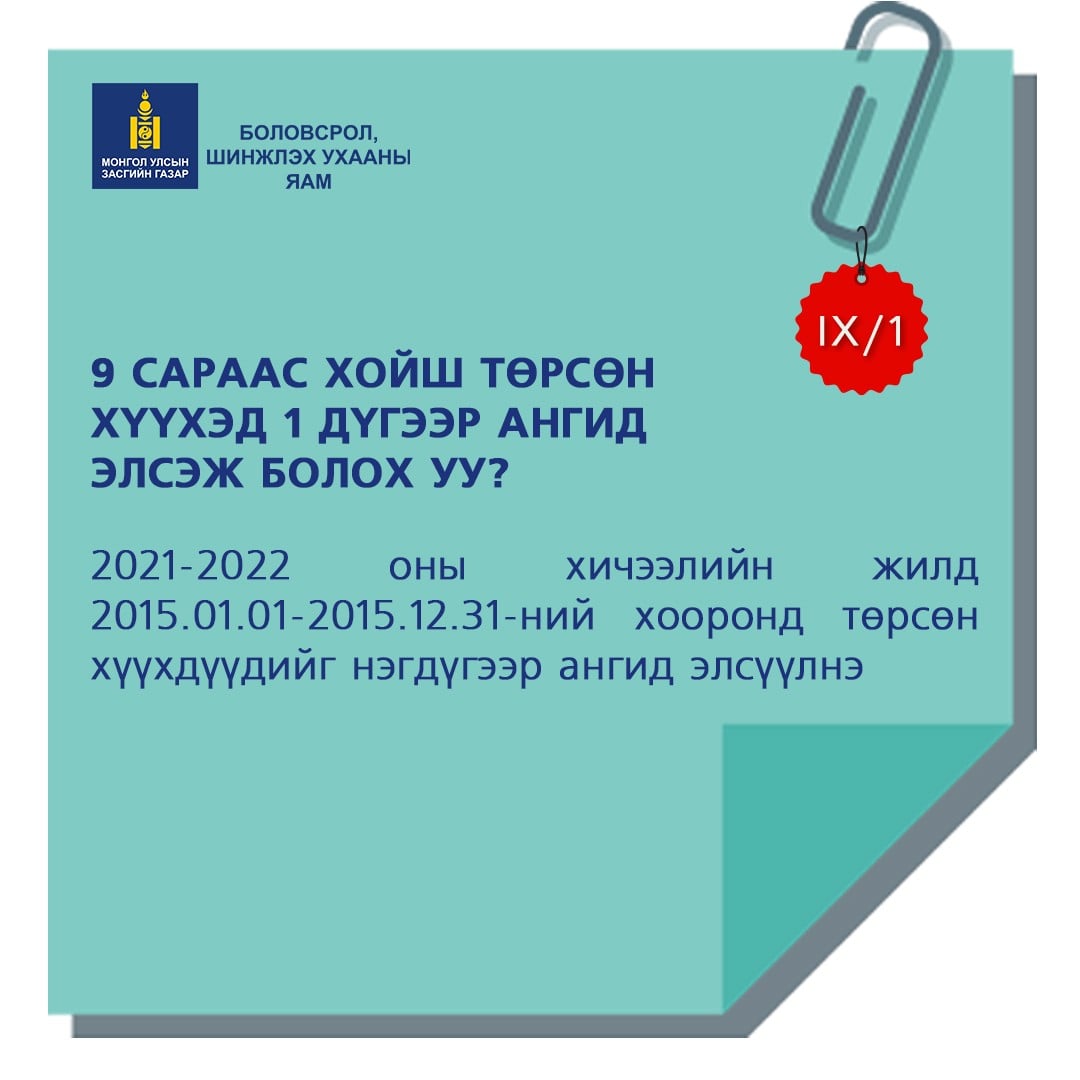2021-2022 оны хичээлийн жилд улсын хэмжээнд ерөнхий боловсролын сургуулийн нэгдүгээр ангид 81 мянга орчим хүүхэд элсэх ажээ.