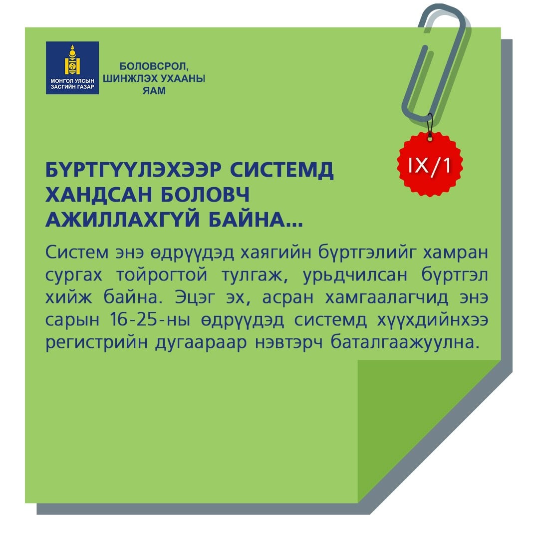 Өнгөрсөн жил бүртгэлийн цахим системийг 50 хувь ашигласан бол энэ хичээлийн жилд бүртгэлийг 100 хувь цахимд шилжүүлж байна.