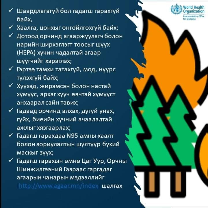 -Агаарын бохирдолд нүдэнд харагдахуйц хэмжээгээр өөрчлөлт орсон. Мөн агаарын давхаргын доогуур тоосжилт их байдаг бөгөөд энэ тоосжилтод хүүхдүүд хамгийн их өртдөг. Энэ нь нүдэнд харагдахгүй. Иймээс иргэдийг бага насны хүүхдийг гадуур дагуулж явахгүй байхыг зөвлөж байна. Мөн хоолойгоо давс, соданы уусмалаар зайлах шаардлагатай. Зайлшгүй тохиолдолд хүүхдээ дагуулж яваа бол амны хаалтыг тогтмол зүүлгэх хэрэгтэй. Иргэд аль болох гэрээсээ гарахгүй байж, гэртээ чийгтэй цэвэрлэгээ хийж, утааны саармагжилт арилтал цонхоо онгойлгохгүй, бүр шаардлагатай бол утаа багассан үед агаар сэлгэлтийг богино хугацаанд хийх хэрэгтэй.