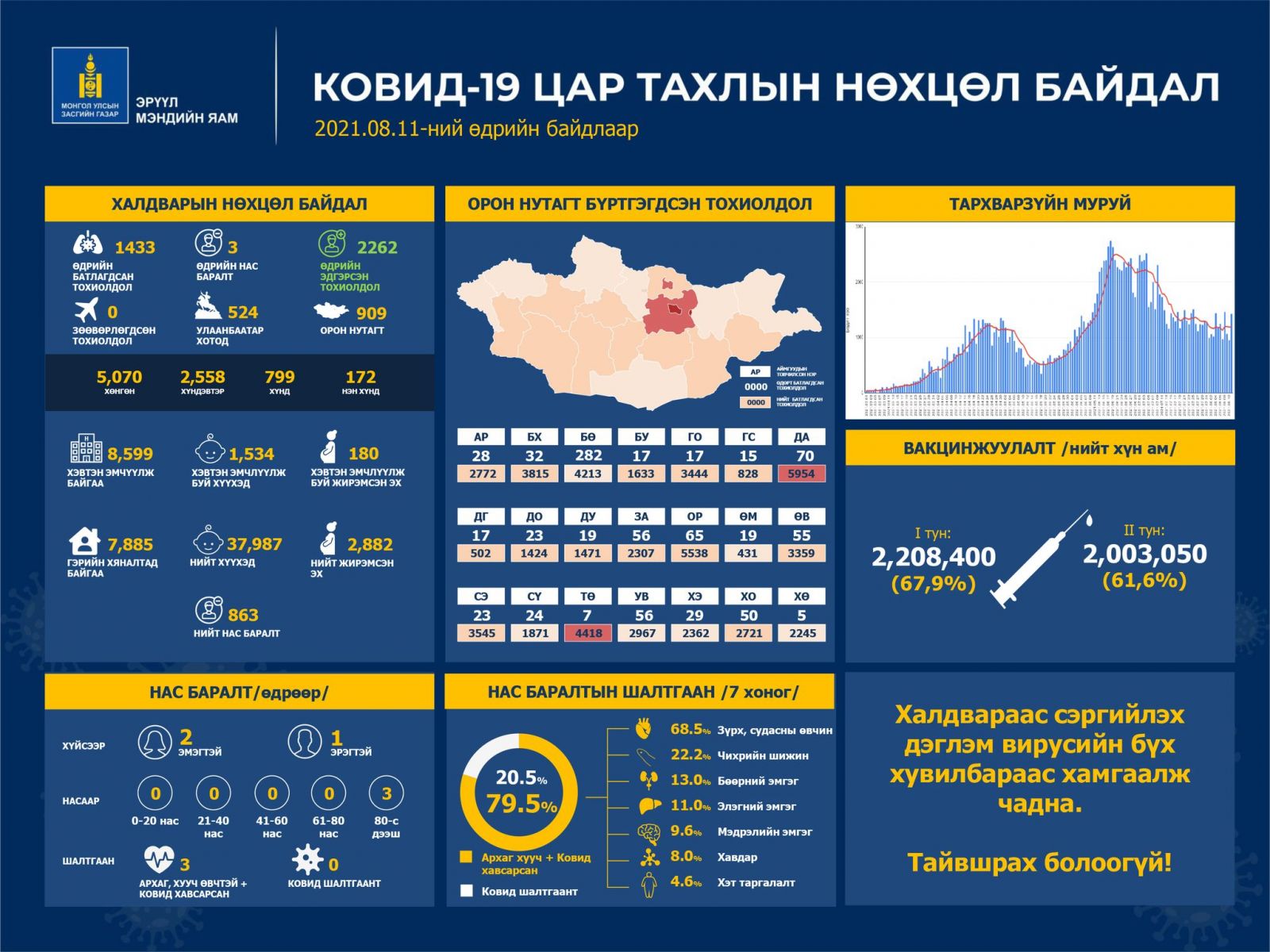 Тэгвэл өнгөрсөн хоногт 2262 хүн эдгэрсэн бол маш хүнд гэсэн оноштой 172 хүн хэвтэн эмчлүүлж байгаа талаар Эрүүл мэндийн яамнаас мэдээллээ.